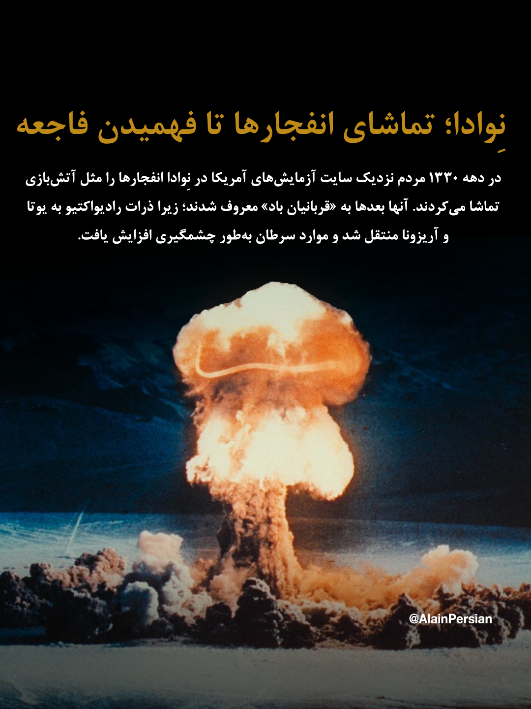 ایالات متحده نیز در دهه ۱۳۳۰ میدان آزمایشهای هستهای خود را در نِوادا بنا کرد. ساکنان مناطق اطراف که ابتدا انفجارها را همچون نمایش آتشبازی تماشا میکردند، بعدها به «قربانیان باد» معروف شدند؛ زیرا ذرات آلوده به مواد رادیواکتیو با جریان هوا به ایالتهای همسایه منتقل شد و افزایش موارد سرطان و بیماریهای تیروئیدی ثبت گردید. دولت آمریکا سالها بعد خسارتها را پذیرفت و برنامههایی برای پرداخت غرامت اجرا کرد، هرچند بسیاری از خانوادهها آن را ناکافی میدانند.