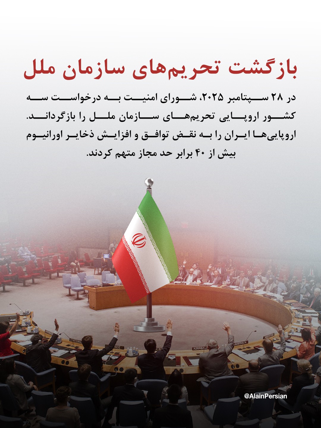 با آنکه طبق تصمیم اولیه شورای امنیت، این توافق قرار بود در ۱۸ اکتبر ۲۰۲۵ بهطور رسمی منقضی شود، اما تمدید تحریمهای سازمان ملل در ۲۸ سپتامبر گذشته عملاً آن را از پیش بیاثر کرده بود. سه کشور اروپایی شامل فرانسه، بریتانیا و آلمان خواستار بازگرداندن این تحریمها شدند و ایران را به نقض توافق از طریق افزایش ذخایر اورانیوم غنیشده بیش از ۴۰ برابر سقف تعیینشده متهم کردند.
