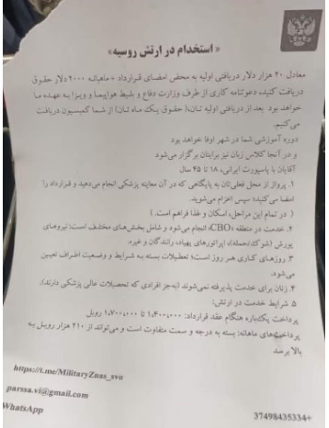 در نسخه منتشرشده از این آگهی، از مردان ۱۸ تا ۴۵ ساله دعوت شده بود تا با امضای قرارداد خدمت در «منطقه عملیات ویژه نظامی» موسوم به CBO به ارتش روسیه ملحق شوند. این آگهی حتی وعده ۲۰ هزار دلار هنگام امضا و حقوق ماهانه ۲ هزار دلار را مطرح کرده بود؛ ادعاهایی که توجه بسیاری را جلب کرد. سفارت روسیه در بیانیه خود تأکید کرد که «هیچیک از ساختارهای رسمی روسیه» ارتباطی با چنین نامهای ندارند و آن را کاملاً ساختگی دانست.