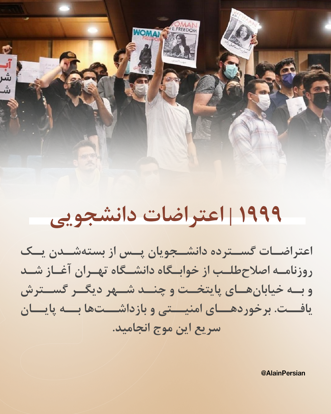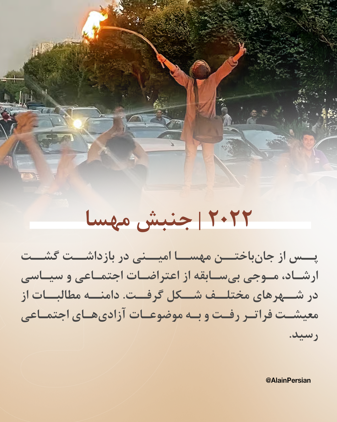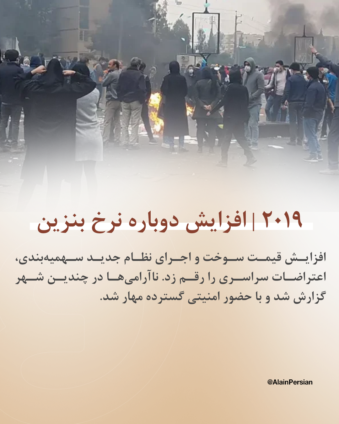 در آبان ۱۳۹۸، افزایش قیمت بنزین بار دیگر خیابانها را ملتهب کرد و اعتراضات به سرعت جنبه امنیتی به خود گرفت. سرانجام، سال ۱۴۰۱ با اعتراضات پس از جانباختن مهسا امینی، نقطه عطفی تازه رقم خورد؛ اعتراضی که مطالبات اقتصادی، اجتماعی و سیاسی را در هم آمیخت و دامنهای بیسابقه یافت.
