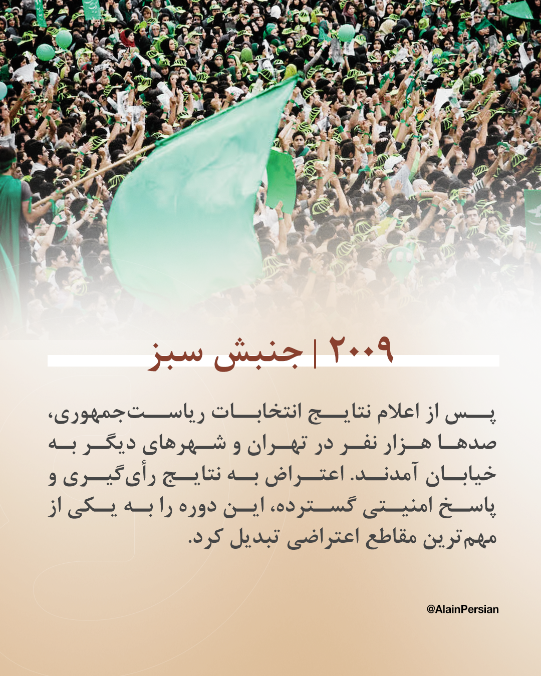 سال ۱۳۸۸ با اعتراضات گسترده پس از انتخابات ریاستجمهوری و شکلگیری «جنبش سبز» به یکی از مهمترین مقاطع اعتراضی تاریخ جمهوری اسلامی تبدیل شد. صدها هزار نفر در تهران و دیگر شهرها به نتایج انتخابات اعتراض کردند، اما سرانجام با اقدامات امنیتی، کنترل خیابانها دوباره به دست حاکمیت افتاد.