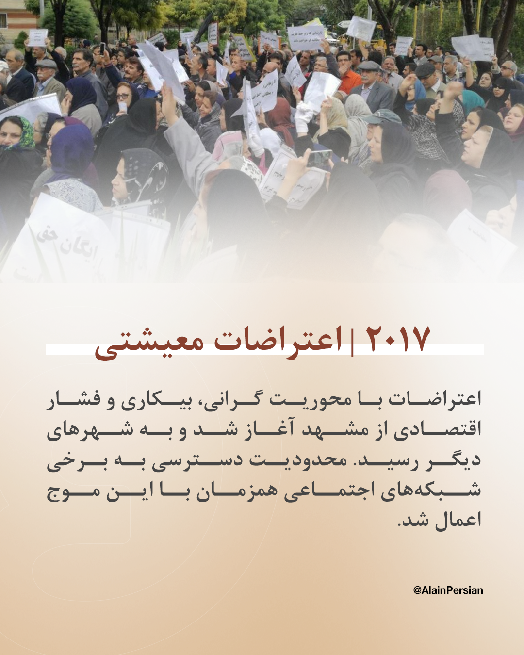 در اواخر ۱۳۹۶، اعتراضات با ماهیتی اجتماعی و اقتصادی از مشهد آغاز شد و به سرعت به شهرهای دیگر رسید. گرانی، بیکاری و نارضایتی معیشتی در مرکز شعارها بود و همزمان، محدودیتهایی بر شبکههای اجتماعی اعمال شد.