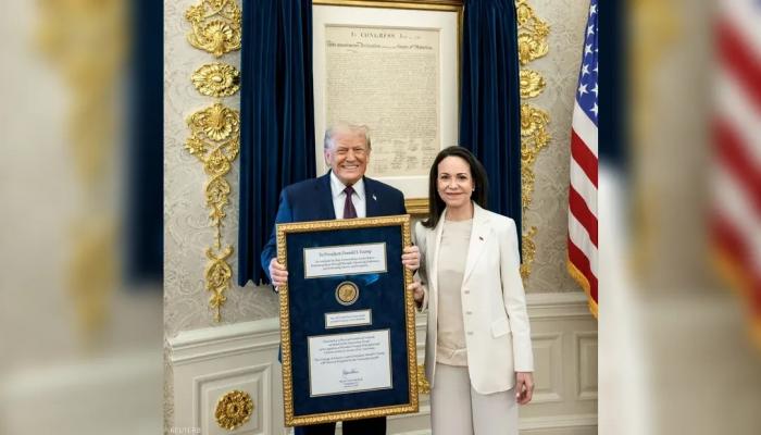 دونالد ترامپ، رئیسجمهور ایالات متحده، روز پنجشنبه از اقدام ماریا کورینا ماتچادو، رهبر اپوزیسیون ونزوئلا، در اهدای نمادین مدال جایزه نوبل صلح به او تمجید کرد