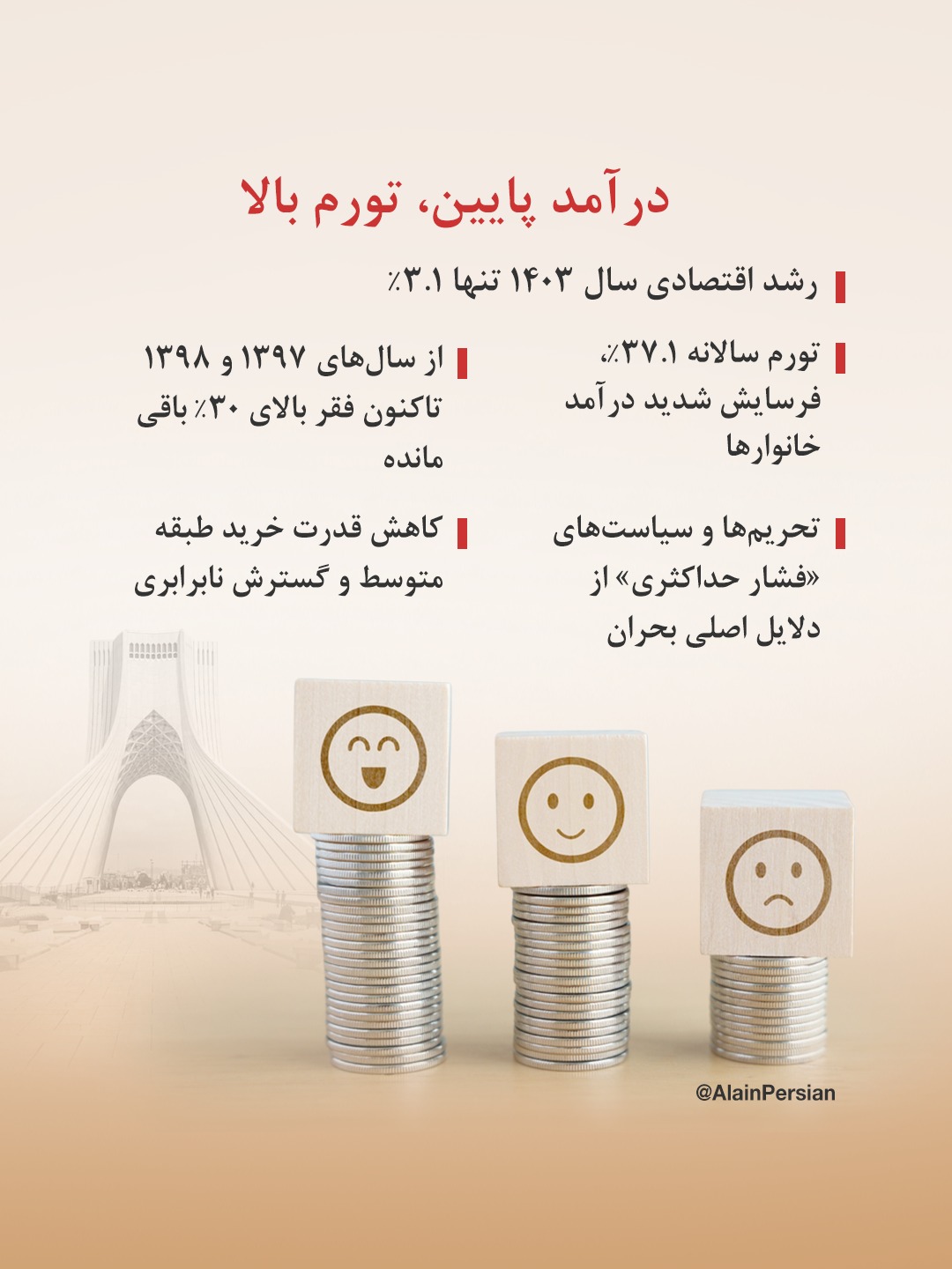گزارشهای مرکز آمار ایران نشان میدهد نرخ رشد اقتصادی در سال ۱۴۰۳ به حدود ۳.۱ درصد رسیده، در حالیکه تورم سالانه ۳۷.۱ درصد بوده است. تورم بالا همراه با رشد اقتصادی اندک، باعث کاهش درآمد واقعی خانوارها و افزایش قابل توجه فقر شده است.
