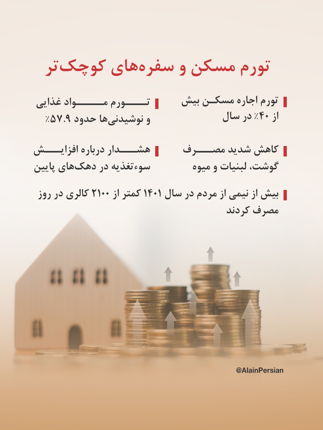 افزایش شدید هزینه مسکن نیز عامل دیگری در رشد فقر است. تورم اجارهبها بیش از ۴۰ درصد اعلام شده و تأثیر مستقیم بر هزینههای خانوارها داشته است. در نتیجه، بسیاری از خانوادهها برای تأمین غذا و کالاهای اساسی با مشکل مواجهاند و سفره غذاییشان کوچکتر شده است. نرخ تورم مواد غذایی و نوشیدنیها تا شهریور ۱۴۰۴ به حدود ۵۷.۹ درصد رسیده که بسیار بالاتر از میانگین تورم عمومی است.