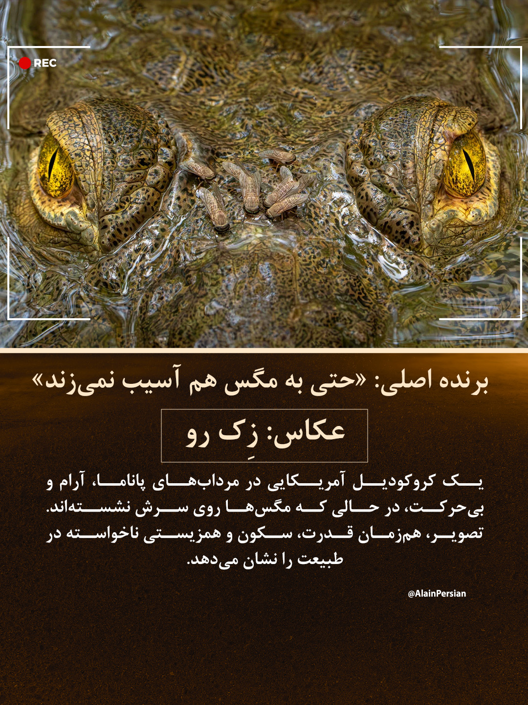 عنوان برنده اصلی امسال به عکسی با نام «حتی به مگس هم آسیب نمیزند» اثر زِک رو تعلق گرفت. این تصویر، یک کروکودیل آمریکایی را در مردابهای پاناما نشان میدهد که بیحرکت مانده و مگسها روی سرش نشستهاند. داوران این اثر را به دلیل ترکیب سکون، قدرت و همزیستی ناخواسته در طبیعت، شایسته بالاترین رتبه دانستند.