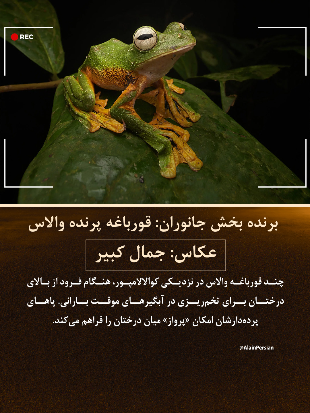 در بخش جانوران، عکس «قورباغه پرنده والاس» از جمال کبیر برگزیده شد. این تصویر لحظه فرود چند قورباغه والاس را در نزدیکی کوالالامپور ثبت کرده است؛ جایی که آنها برای تخمریزی به آبگیرهای موقت ناشی از باران بازمیگردند. پاهای پردهدار این گونه امکان حرکت گلایدی میان درختان را فراهم میکند.