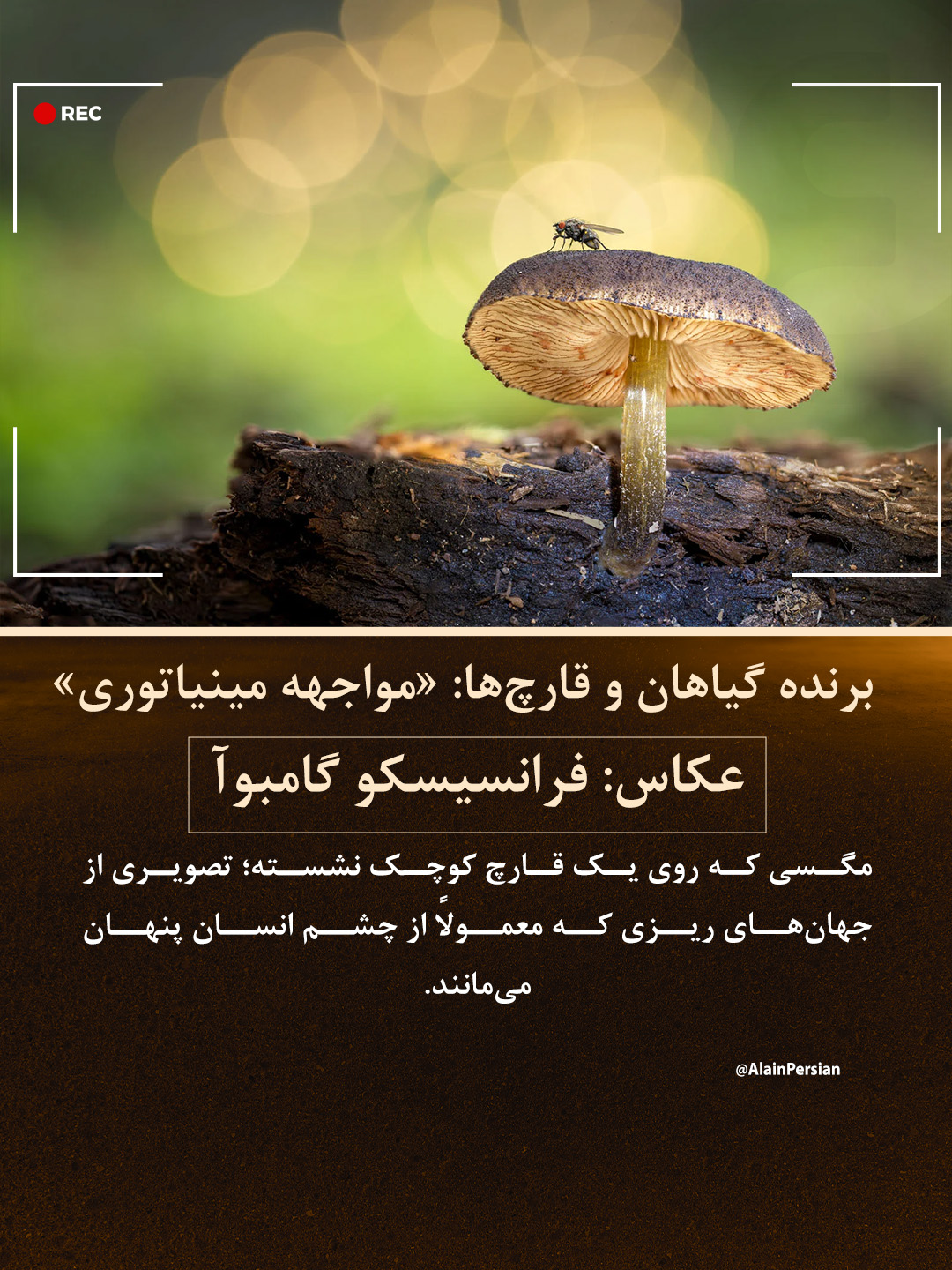 در بخش گیاهان و قارچها، فرانسیسکو گامبوآ با عکس «مواجهه مینیاتوری» برنده شد؛ تصویری از مگسی که روی یک قارچ کوچک نشسته و توجه را به جهانهای ریز و کمتر دیدهشده جلب میکند.