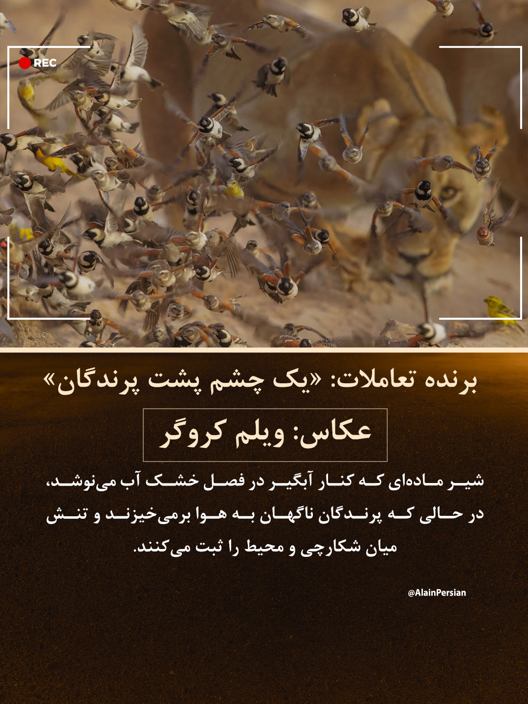 در بخش تعاملات، عکس «یک چشم پشت پرندگان» اثر ویلم کروگر انتخاب شد که لحظه نوشیدن آب توسط یک شیر ماده و واکنش ناگهانی پرندگان اطراف آبگیر را ثبت کرده است.