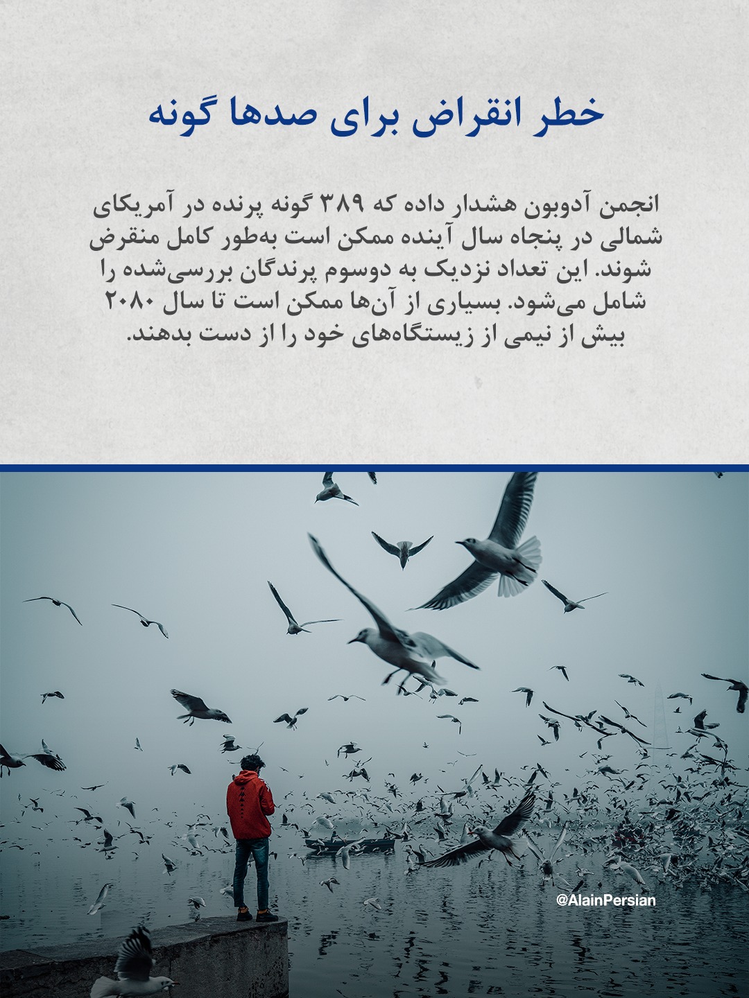 براساس هشدار انجمن ملی آدوبون، حدود ۳۸۹ گونه پرنده در آمریکای شمالی در پنجاه سال آینده در معرض خطر انقراض قرار دارند. این تعداد تقریباً دوسوم گونههایی را شامل میشود که در این مطالعات بررسی شدهاند. پژوهشها نشان میدهند که این گونهها ممکن است تا سال ۲۰۸۰ بیش از نیمی از زیستگاههای خود را از دست بدهند.